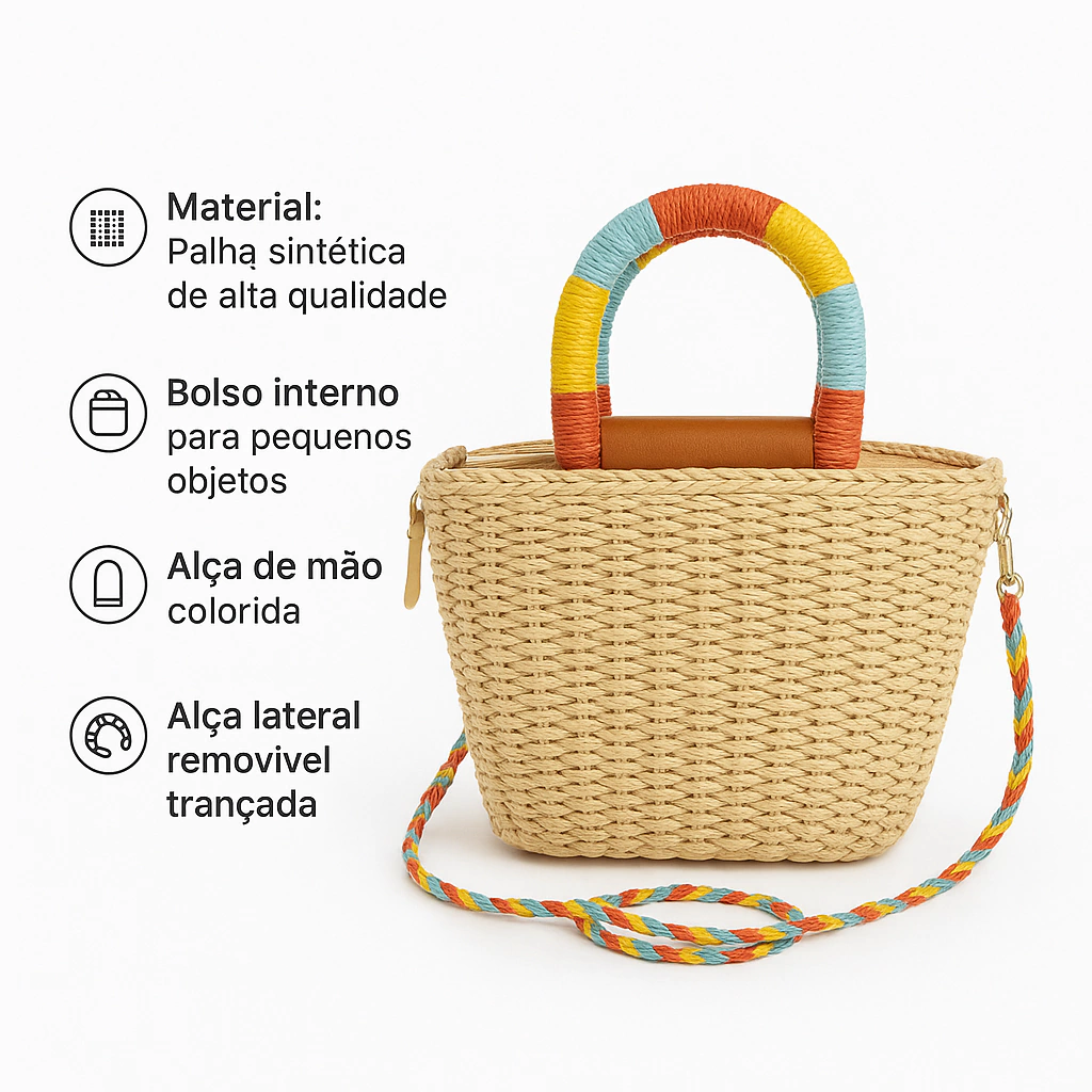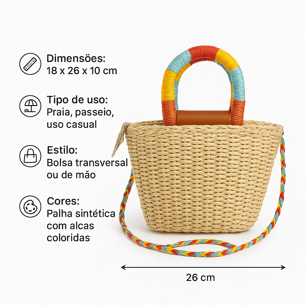 A bolsa de praia em palha sintética com alça de mão colorida e alça lateral removível é o acessório perfeito para quem busca praticidade, estilo e versatilidade. Compacta e funcional, conta com forro interno na mesma cor da bolsa, bolso interno para pequenos objetos e fecho em zíper que garante mais segurança. Seu design moderno combina o charme da palha com detalhes coloridos, ideal para levar celular, carteira, chaves e itens essenciais no dia a dia, viagens ou passeios à beira-mar.