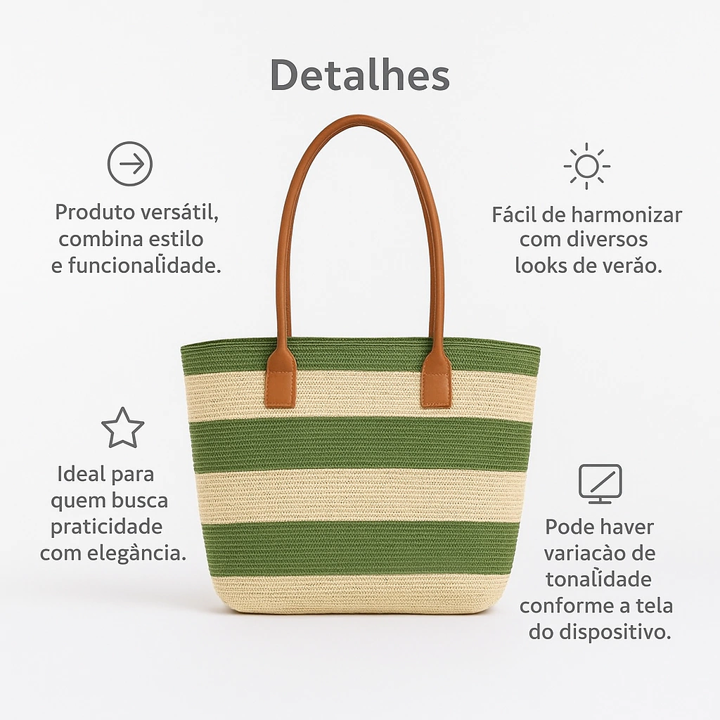 A Bolsa de Praia com Alça de Couro Sintético combina praticidade e estilo em um design moderno e versátil. Produzida em material de palha sintética com listras horizontais, oferece leveza e resistência, perfeita para o dia a dia, praia, piscina ou passeios. Suas alças de couro sintético reforçado garantem conforto e durabilidade, enquanto o forro interno com bolsinho proporciona organização extra. Uma peça indispensável para compor looks casuais e de verão com elegância.