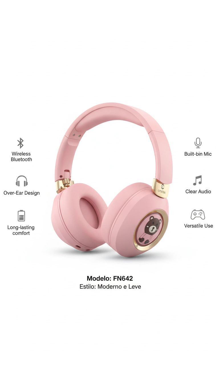 O Fone de Ouvido Bluetooth FN642 Wireless Headset oferece som de alta qualidade, design moderno e confortável para uso prolongado. Ideal para crianças e adultos, conta com conexão estável via Bluetooth, bateria duradoura e acabamento ergonômico. Perfeito para música, estudos, jogos e lazer, une praticidade e estilo no dia a dia.
