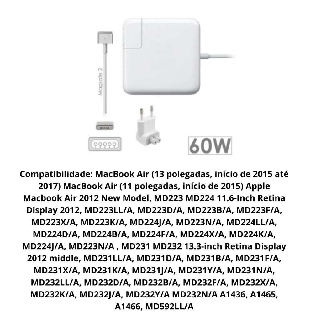 Garanta um carregamento seguro e eficiente com a Fonte Carregador MagSafe 2 60W. Compatível com MacBook Air e Retina Display, oferece proteção contra sobrecarga, curto-circuito e superaquecimento. Com design magnético e conector de 5 pinos, garante encaixe preciso e recarga rápida.