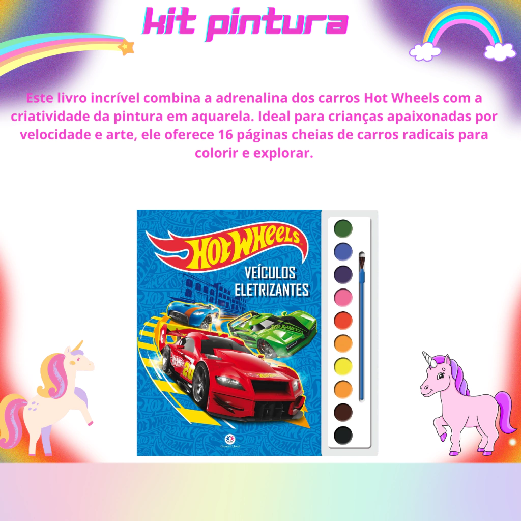 Este livro incrível combina a adrenalina dos carros Hot Wheels com a criatividade da pintura em aquarela. Ideal para crianças apaixonadas por velocidade e arte, ele oferece 16 páginas cheias de carros radicais para colorir e explorar.